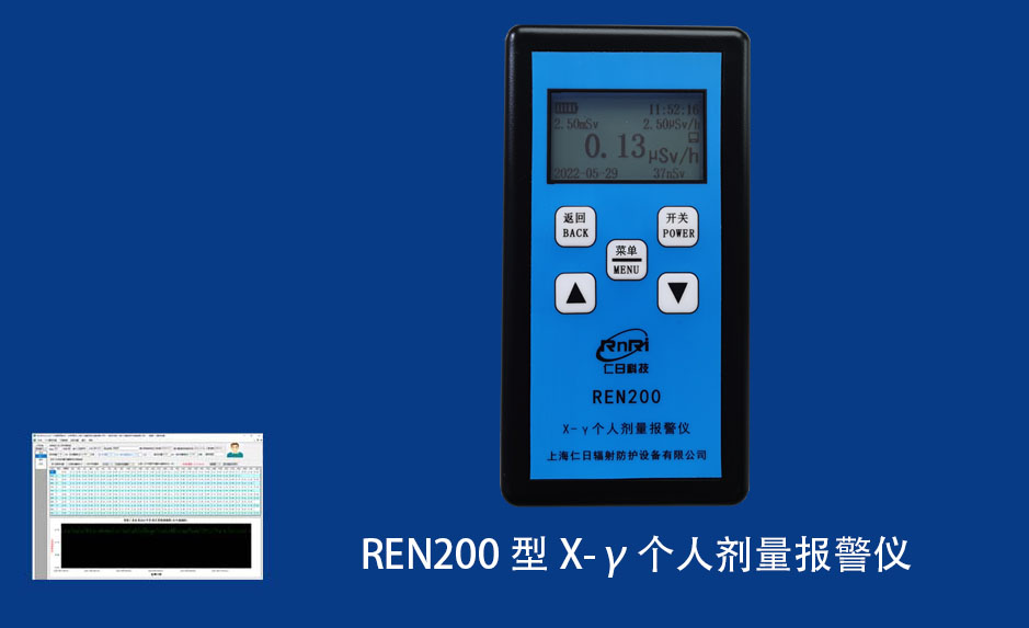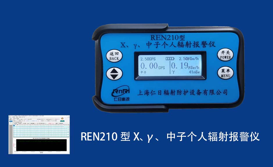 REN210型X、γ、中子个人辐射报警仪内置SiPM和锂玻璃晶体组成中子探测器仪器,采用反照率方式探测中子射线,同时也能探测X、γ射线。因此它可同事监检测X、γ、中子三种射线。能显示工作场所的剂量当量率和累积剂量,更换电池时,日期及累积数据能永久保存。可选配RenRiPersonal个人剂量管理软件,该软件可存储多个人的历史数据,能记录日累积、月累积、年累积、辐照时长、计算平均剂量率、扣除或不扣除本底辐射,且以文字和图谱的方式展现数据。广泛应用于环保、化工、水泥、煤矿、土木工程、石油、医院、疾控、进出口商检、核电、加速器、机场、中子源库和其他安检、边境控制海关检测等领域中的工作人员进行个人安全防护